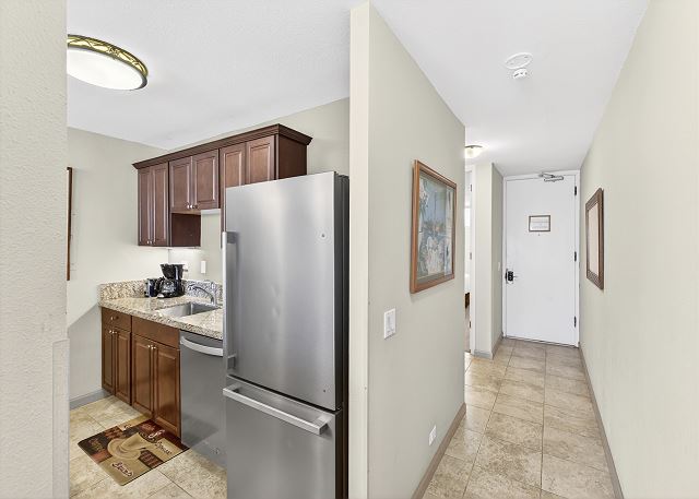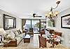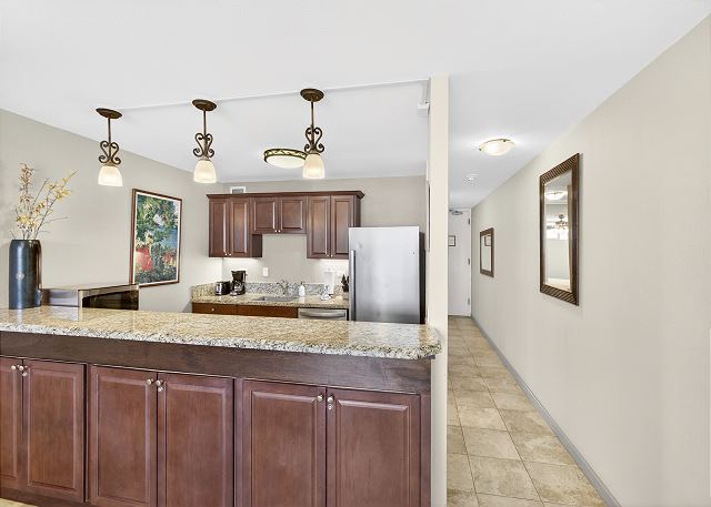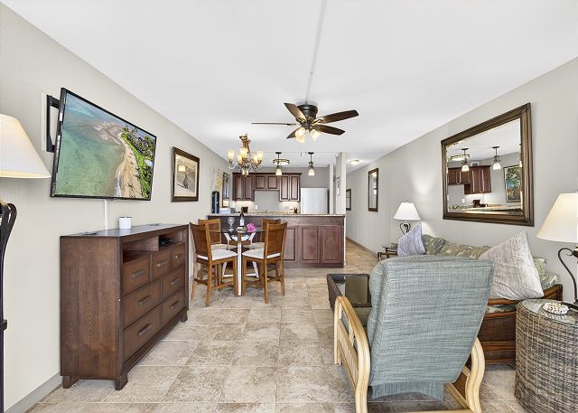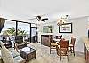 The bright, open living area is designed for comfort and connection. A large wall‑mounted TV with cable, a sleeper sofa, and a king bed in the bedroom allow the condo to accommodate up to four guests with ease. Inside, a dining table for four is perfect for meals or game nights, while the extended breakfast bar is ideal for casual brunches or serving up a buffet spread.