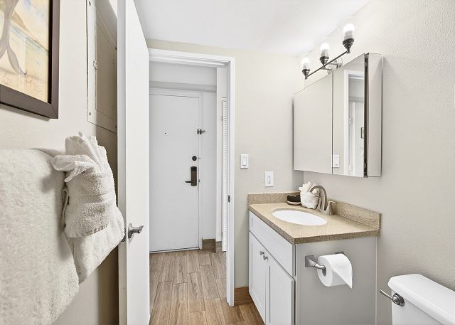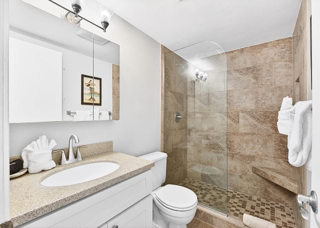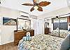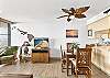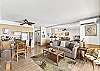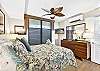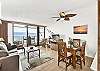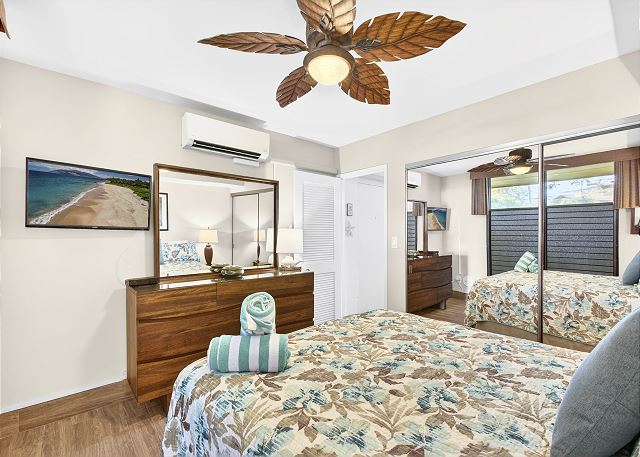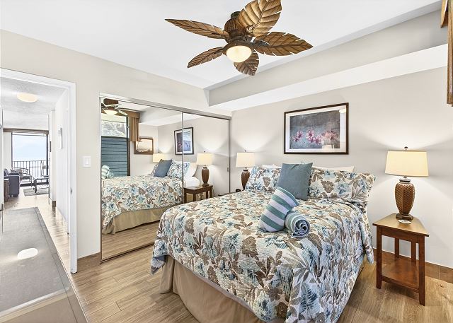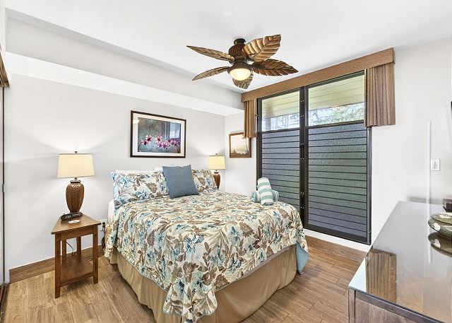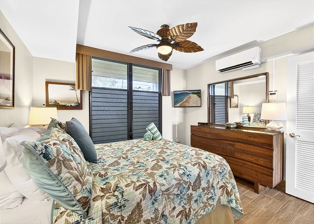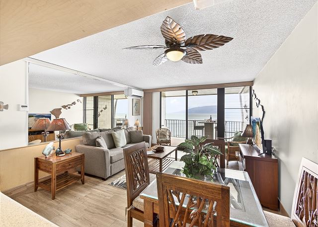 The fully equipped kitchen makes dining in a breeze, whether you’re whipping up breakfast before a beach day or preparing a sunset dinner. Enjoy your meals al fresco on the expansive private lanai, where panoramic ocean views create an unforgettable backdrop. Indoors, the soothing tropical palette keeps the space feeling fresh and serene. With air conditioning and ceiling fans throughout, you’ll stay cool and comfortable after a day in the Maui sun.