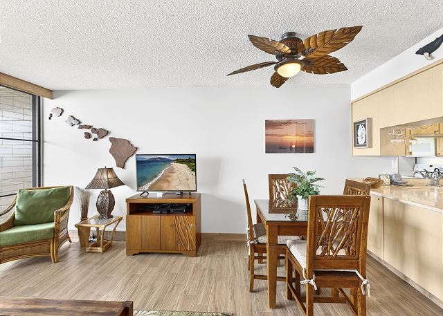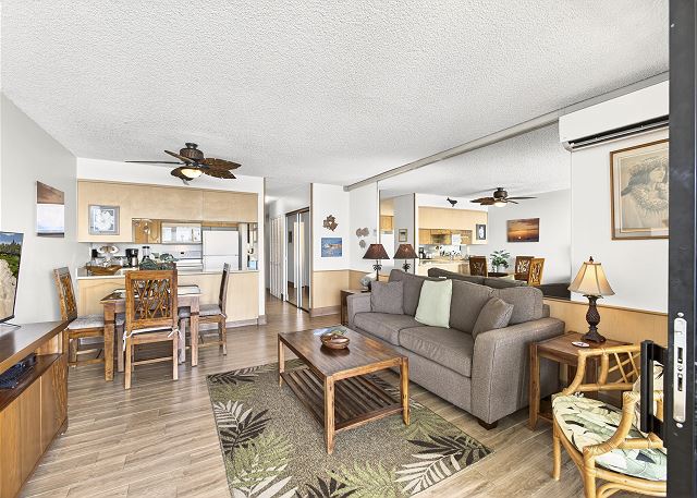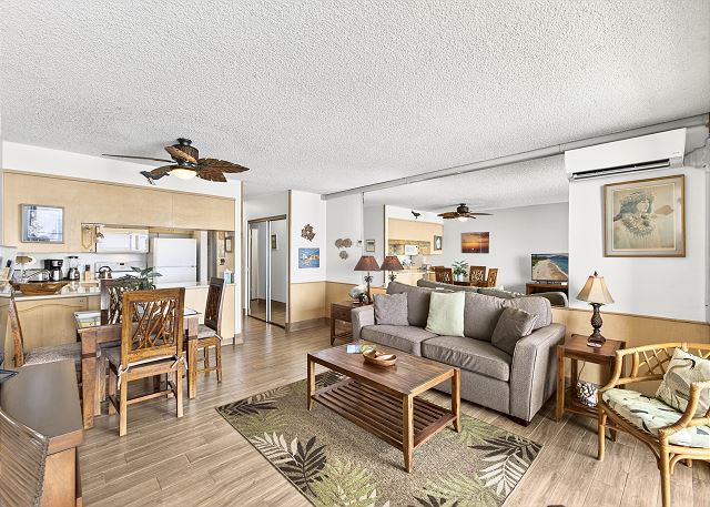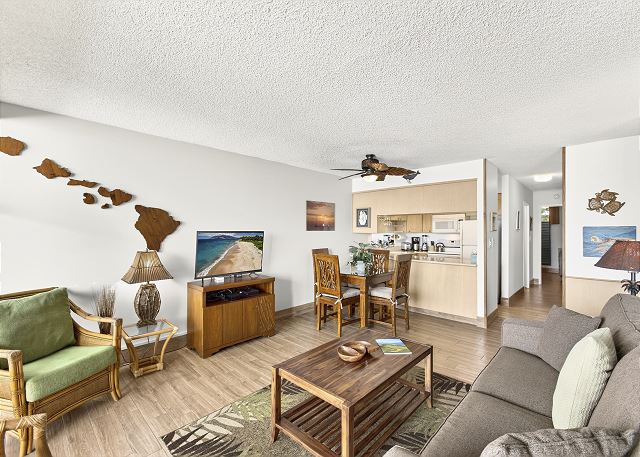 Noelani 216 is a beautifully updated, spacious studio condo that blends island charm with modern comfort. Thoughtfully designed and tastefully furnished, this inviting retreat offers everything you need for a relaxing Maui escape. The studio features a plush Queen bed, a large flat-screen TV, and cool, calming décor that instantly puts you in vacation mode. A few steps away, the bathroom boasts a generous walk-in shower. For added flexibility, the living area includes a Queen sleeper sofa—perfect for families or additional guests.
